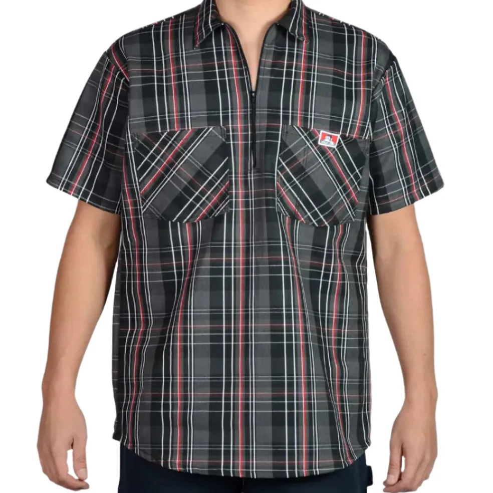 Half Zip Short Sleeve Black & Red Plaid